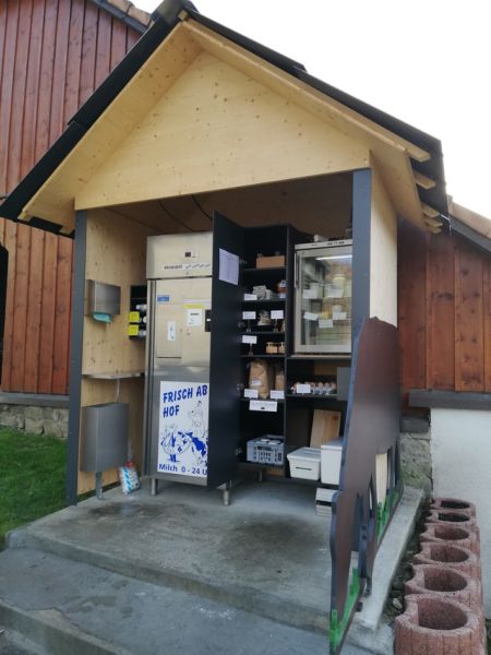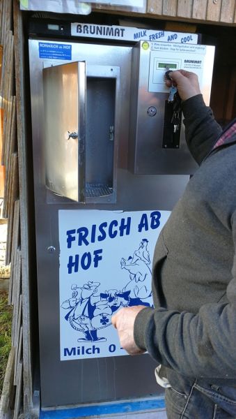 Juli 2019 Der ca. 15-jährige Milchautomat wird durch das aktuelle Modell ersetzt. Dieses bietet dank SMS-Modul mehr Komfort für uns als Betreiber. Gleichzeitig erfolgt der Wechsel zu Milchkannen aus Chrom-Nickel-Stahl - und ein neues, höheres Milchhüsli muss gebaut werden.