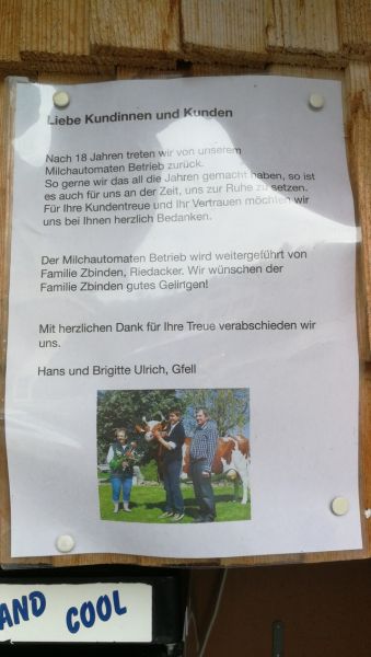 Mai 2019 Eine Ära geht zu Ende. Nach 18 Jahren sucht und findet Familie Ulrich aus dem Gfell eine Nachfolge für das Milchhüsli im Heubach.